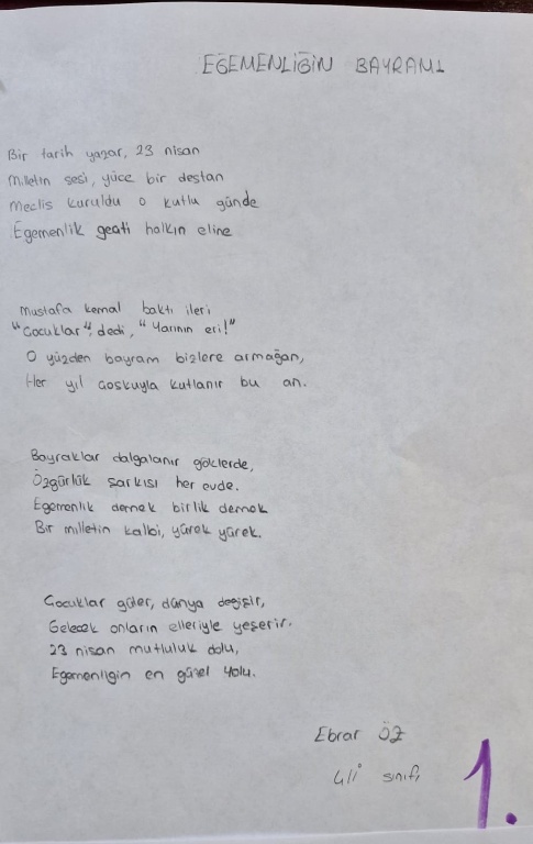 DİLİMİZİN ZENGİNLİKLERİ PROJESİ- 23 NİSAN ULUSAL EGEMENLİK VE ÇOCUK BAYRAMI KONULU ŞİİR YARIŞMAMIZI SONUÇLANDIRDIK.